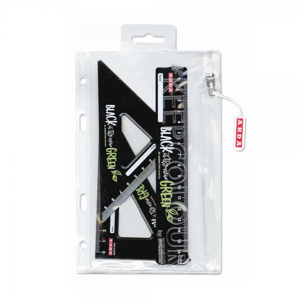 Il set contiene 3 pezzi realizzati in plastica riciclata: una squadra 45° da 10 cm, una squadra 60° da 15 cm e un righello da 16 cm.