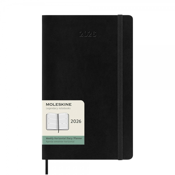 Moleskine 12-month horizontal weekly planner from January to December 2026 in the large 13x21 cm format with black soft cover .