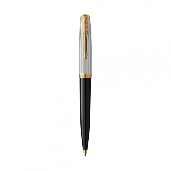 Ha un corpo in resina nero lucido e un cappuccio con finiture in argento e oro cesellato e la caratteristica clip a freccia di Parker.