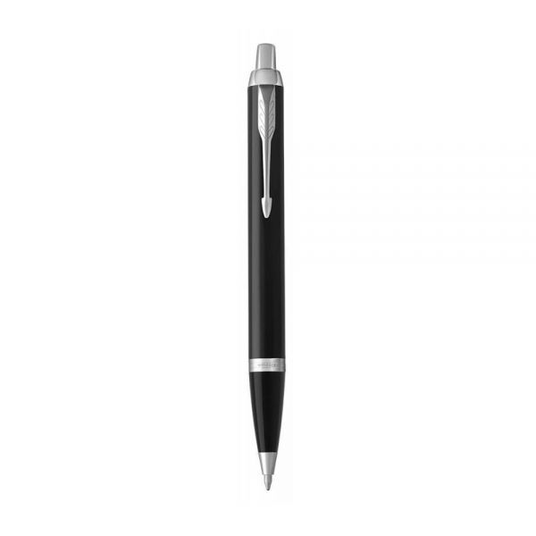 Parker IM Ballpoint Pen with glossy black lacquer and chrome trim .