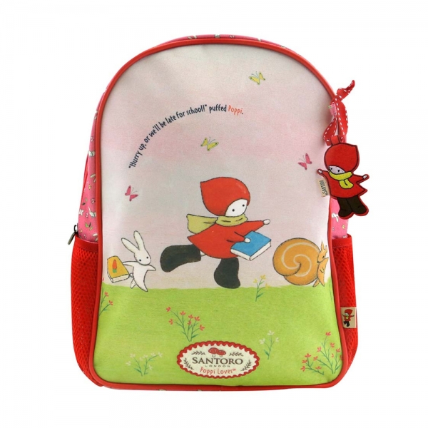 Santoro Poppi Loves Kindergarten Backpack with the artwork Catch Me depicting Poppi, Squirrel and White Bunny running to school with the words "Hurry up, or we'll be late for school!".