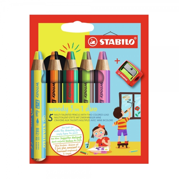 Stabilo Woody 3 in 1 Duo Case of 5 multipurpose pencils with two-tone lead and sharpener.