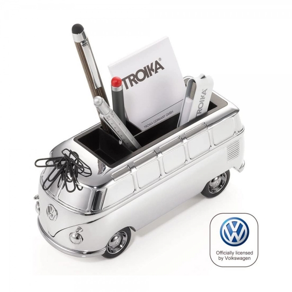 Troika Fermacarte e portapenne cromato lucido a forma di Volkswagen Bulli (T1, Samba bus, 1962) con motore ad attrito.