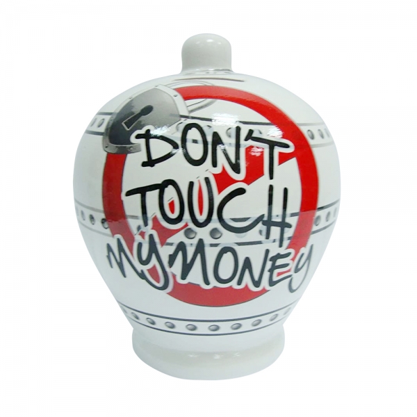 Virca Piggy Bank in glazed terracotta with personalized Don't Touch My Money graphics.
