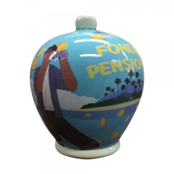 Virca Salvadanaio in terracotta smaltata con grafica personalizzata Fondo Pensione.