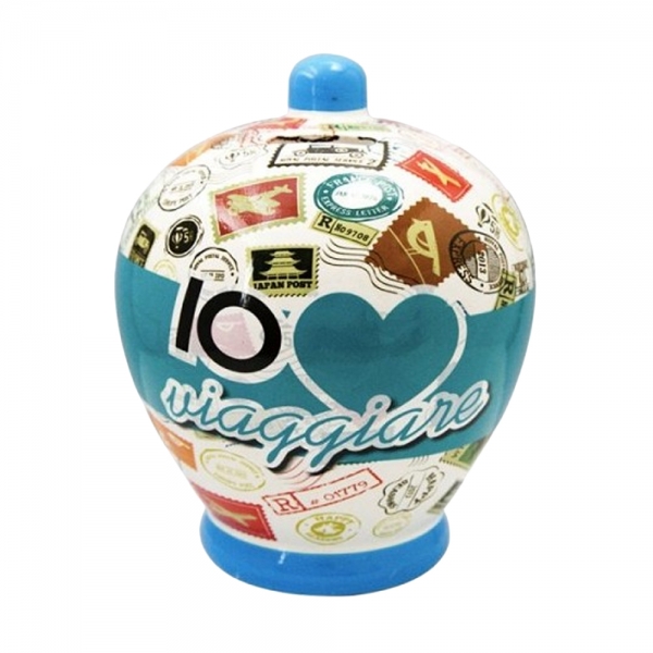 Virca Salvadanaio in terracotta smaltata con grafica personalizzata Io Amo Viaggiare.
