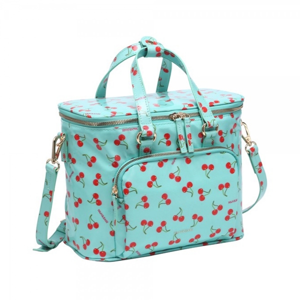 Naj-Oleari Cherry Lunch Box with shoulder strap with cherry pattern in light blue .